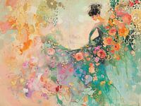 Details: Frau, Blumen, Gemälde, Rosen, elegant, bunt, modern, Kunst, grün, pfirsich