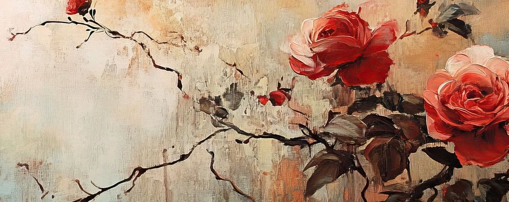 Flower Art | Ornate Rose Branches - Diese Blumenmalerei zeigt eine Reihe leuchtend roter und rosafarbener Rosen mit zarten Blütenblättern, die auf skurrilen, dunklen Zweigen vor einem sanft gefärbten Hintergrund mit blauen und orangefarbenen Tupfern verstreut sind.