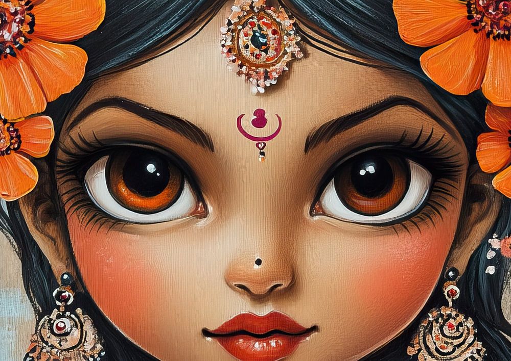 Blumenmädchen - Dieses Frauenbild zeigt ein Mädchen mit großen, funkelnden Augen und auffallend orangefarbenen Blumen im Haar, die dem Porträt einen fröhlichen Ausdruck verleihen.