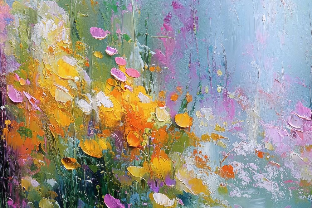 Wunderschönes abstraktes Motiv von bunten Blumen an einem Teichufer.