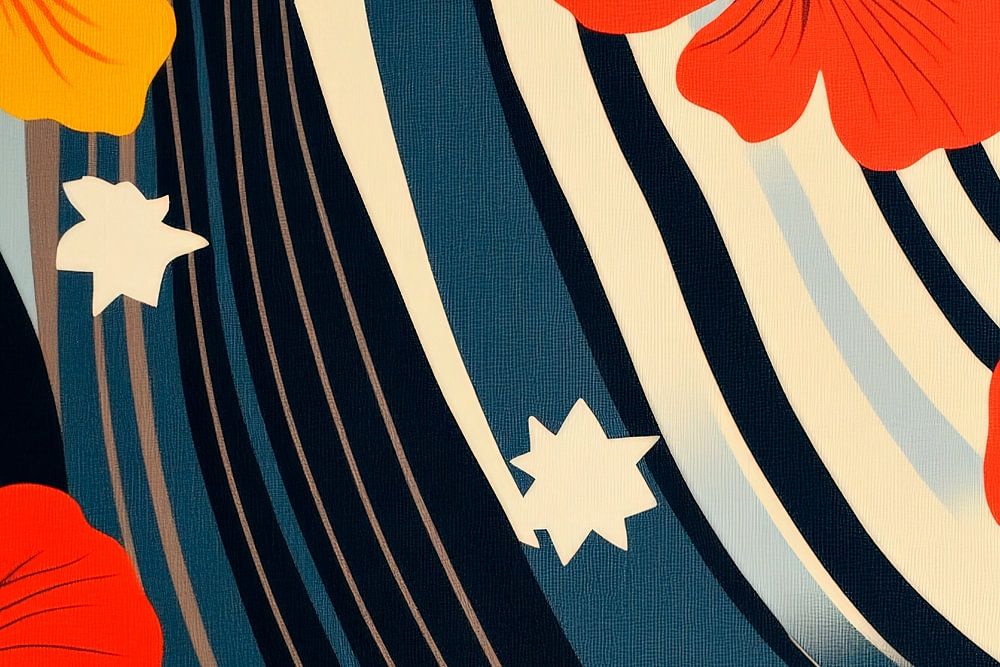 Farbenfrohe Hibiskusblüten tanzen vor einem dynamischen, wellenförmigen Hintergrund. Die kräftigen Rottöne und leuchtenden Gelbnuancen bringen eine lebendige Energie in den Raum. Diese florale Komposition verleiht dem Wohnzimmer eine entspannte Urlaubsatmosphäre und sorgt für einen Frischekick, ideal für geselliges Beisammensein.