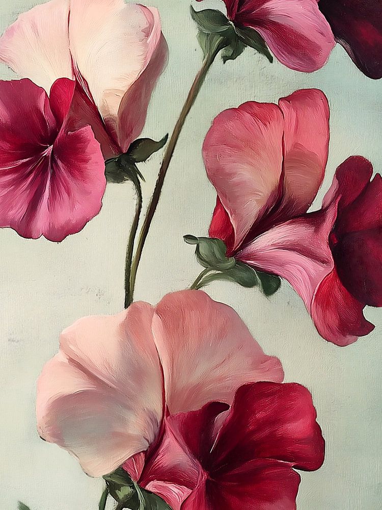 Diese Illustration fängt die zarte und doch lebendige Schönheit von Erbsen ein - eine der poetischsten Blumen im Garten. Ihre gewundenen Stängel und schmetterlingsartigen Blütenblätter vermitteln ein Gefühl der Bewegung, als ob sie in einer sanften Sommerbrise schweben würden. Die Farbpalette, die von sanften Pastelltönen bis hin zu tiefen Rottönen reicht, schafft einen harmonischen Kontrast, der die natürliche Eleganz der Blume unterstreicht. Der gedämpfte Hintergrund verleiht den Blumen eine zeitlose Qualität und lässt sie wie in einem ruhigen Moment der Schönheit schweben.