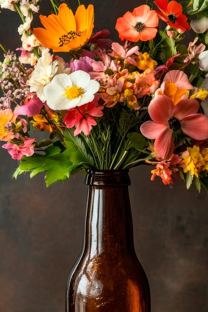 In einem warmen, einladenden Licht erblühen lebendige Blumen in einem rustikalen Glasflasche, deren earthy Töne zurückhaltende Eleganz ausstrahlen. Die bunte Blütenpracht, von zartem Lila bis strahlendem Orange, verleiht jedem Raum ein Gefühl von Frische. Perfekt im Wohnzimmer, um eine harmonische und lebendige Atmosphäre zu schaffen.