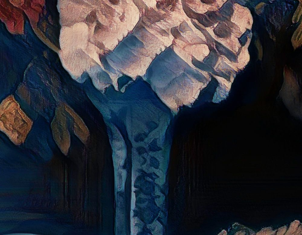 Blumenstrauß in delfterblauer Vase auf antikem Tablett. Hortensien, Rosen und Gerbera.