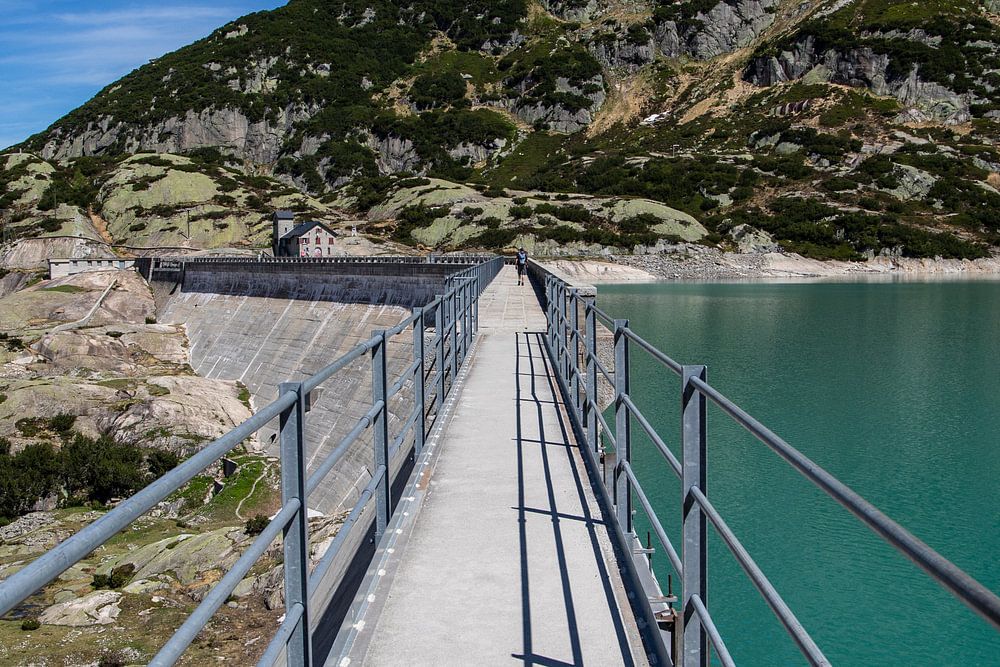 Der Gelmersee ist ein Wasserkraftwerk im Berner Oberland, Schweiz. Super klares Wasser. Brücke über den Damm. Kontrast.