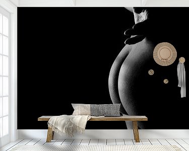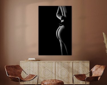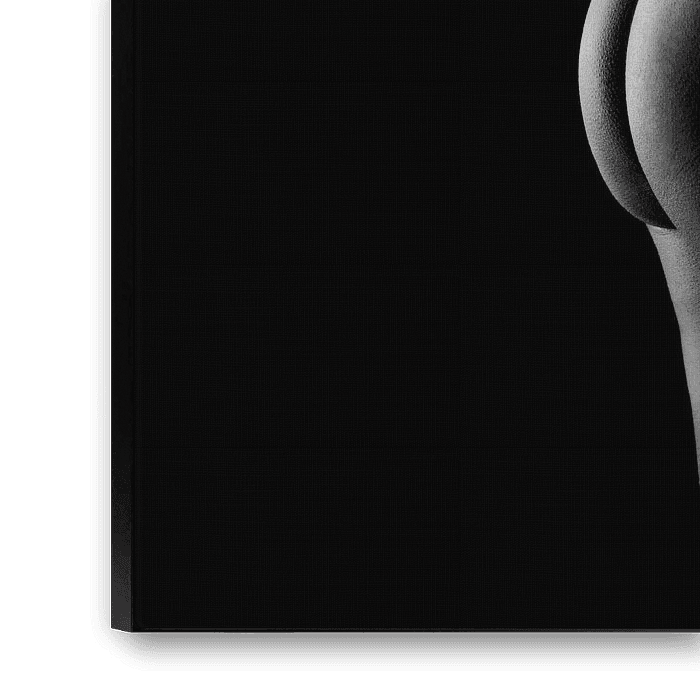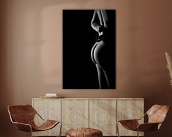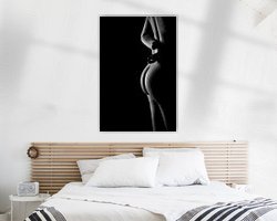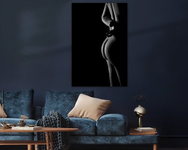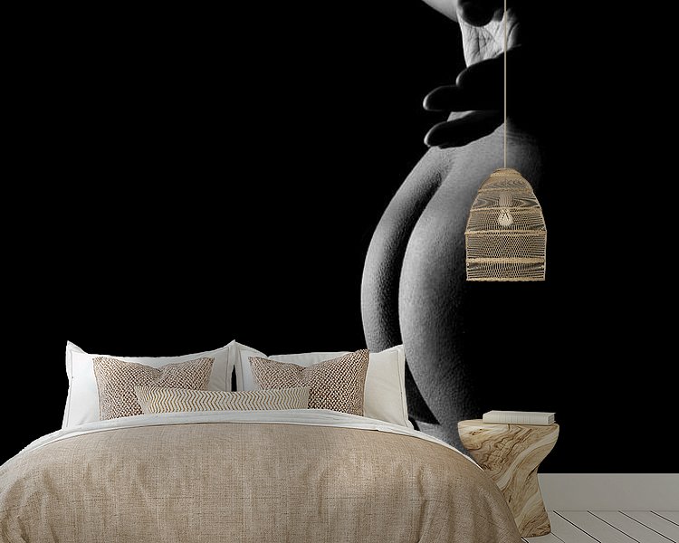 Die hier verwendete Technik hat ihre Wurzeln in der Kunstfotografie, wo die sorgfältige Kontrolle von Licht und Schatten von größter Bedeutung war. Die Beleuchtung wurde absichtlich weich gewählt, um die Textur der Haut und die Rundungen des Körpers hervorzuheben, ohne das Bild mit Details zu überfrachten. Das Ergebnis ist eine zeitlose, ätherische Fotografie, die sowohl Verletzlichkeit als auch Stärke hervorruft und sich perfekt dazu eignet, eine friedliche und doch kraftvolle Atmosphäre in jedem Innenraum zu schaffen.