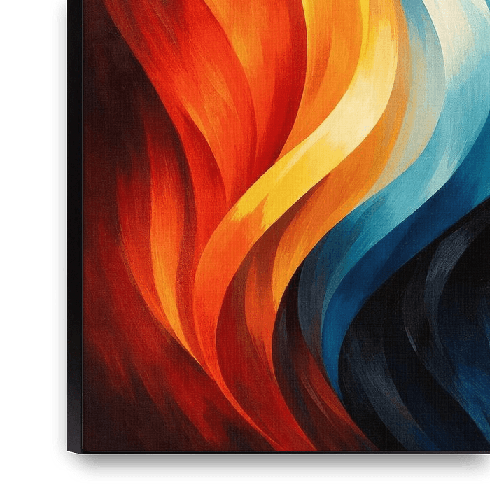 Auffälliges abstraktes Kunstwerk mit fließenden organischen Formen und lebhaften Kontrasten zwischen warmen Rottönen, Gelbtönen und kühlen Blautönen. Die dynamische vertikale Bewegung und die malerischen Texturen schaffen ein kraftvolles, modernes Statement, das sich perfekt für zeitgenössische und stilvolle Innenräume eignet.