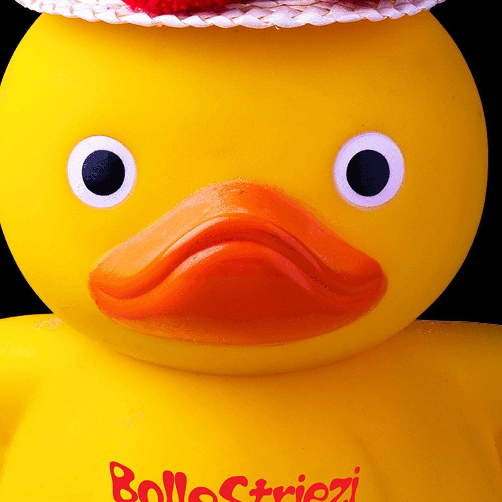 Geboren ist er auf dem Titisee und aufgewachsen bei seiner Oma in Gutach. Da hat er von der Oma auch den Bollenhut geschenkt bekommen, weil ihm die Sonne immer so aufs Dach schien. Seinen Namen hat er dort bekommen, weil vor ihm kein Quietsche-Entchen sicher war. In den Ferien war er oft bei seinen Verwandten in Freiburg und am liebsten im Bächle.