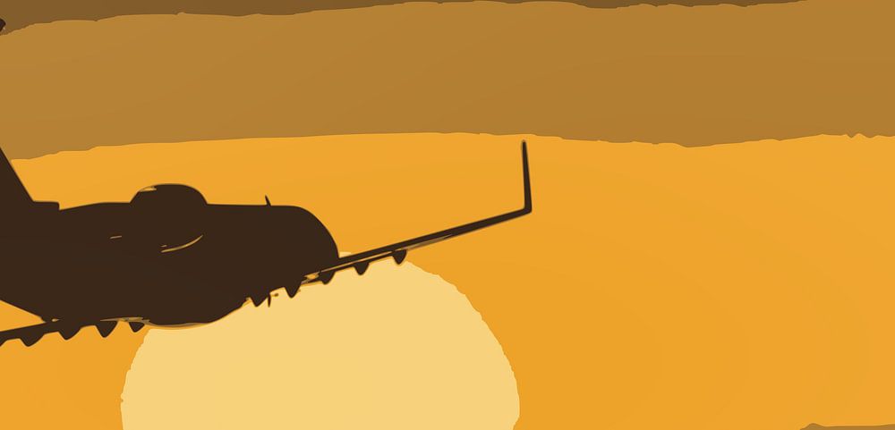 Ein Bombardier CRJ-200ER fliegt durch einen Vektor Himmel bei Sonnenuntergang oder Sonnenaufgang, mit bunten Wolken im Hintergrund. Das Flugzeug , mit einer schwarzen Silhouette , fliegt direkt in Richtung der Sonne.