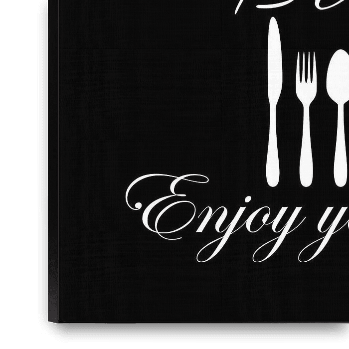 Guten Appetit, leckeres Essen, gutes Essen. Die Hintergrundfarbe ist schwarz, die Buchstaben sind weiß. Text auf Leinwand oder anderem Material