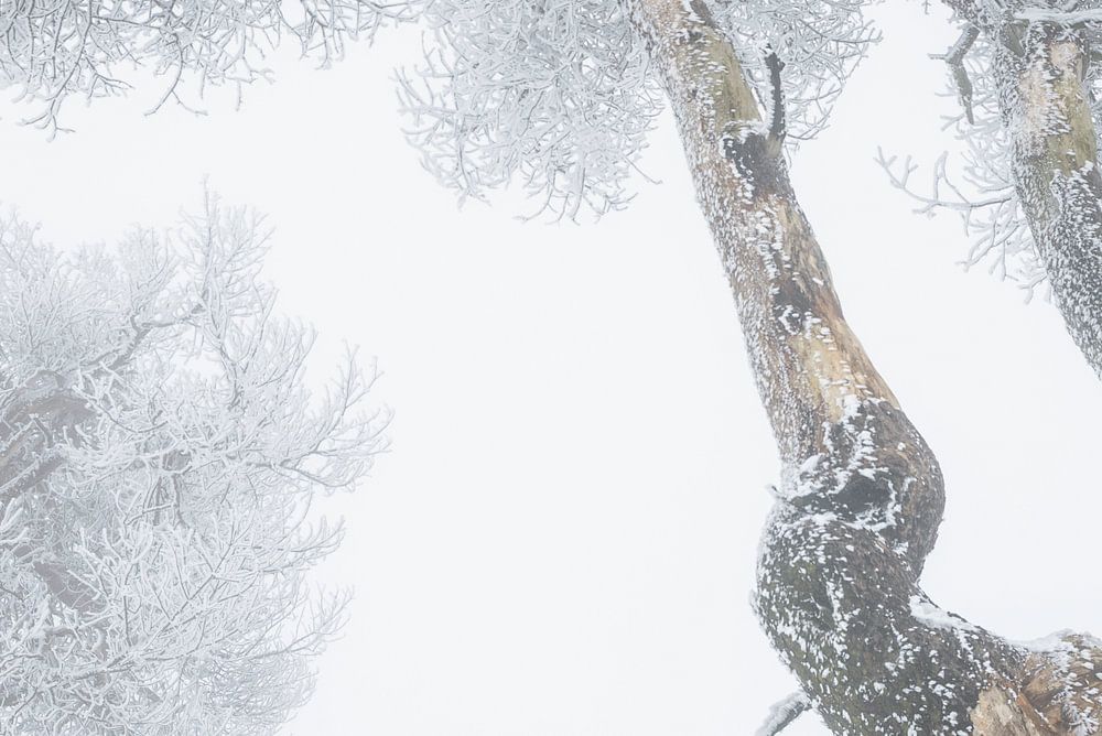 Boomkruinen van verbrande, dode bomen met rijp bij mistige omstandigheden