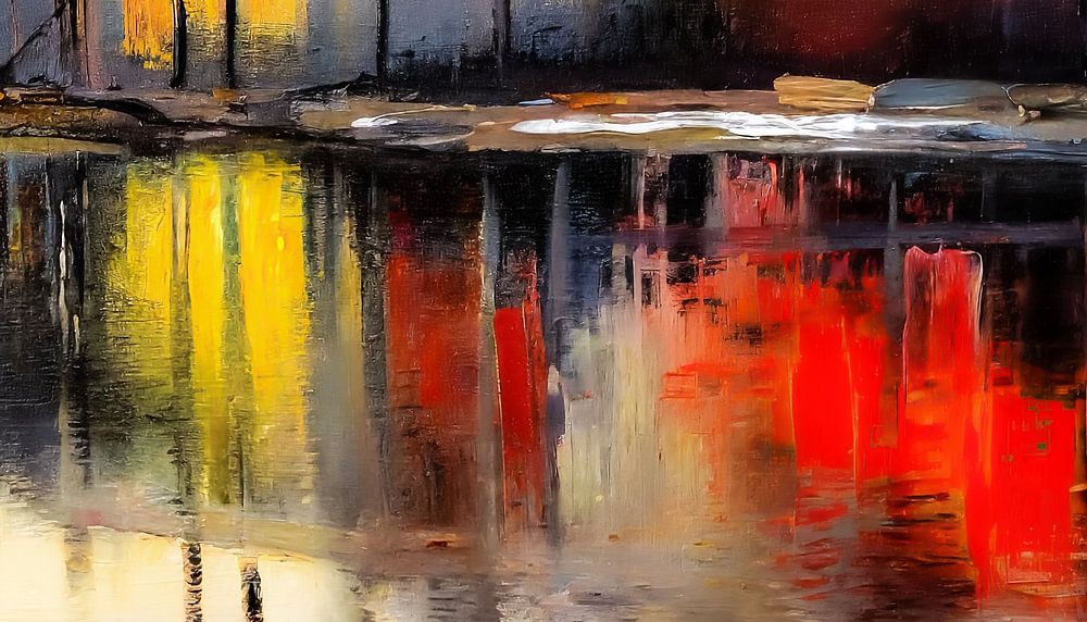 Ein kleines rotes Boot treibt friedlich auf einer ruhigen Wasseroberfläche, während lebendige, abstrakte Reflexionen verschiedener Farben auf dem Wasser tanzen. Im Hintergrund sind hohe, undeutliche Strukturen zu sehen, die der Szene Tiefe und Faszination verleihen.... Das digitale Kunstbild wurde von mir designt, wobei ich Komposition, generative KI und Retusche verwendete.