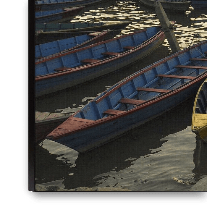 Bestelle dieses Landschafts-Wandbild Boote und goldenes WasserNepal, Pokhara: Der Phewa-See und die umliegenden Vorgebirge, eine Landscha von Michael Semenov als Reproduktion auf Leinwand, Alu-Dibond, als Poster, Fototapete oder Acrylglasbild.