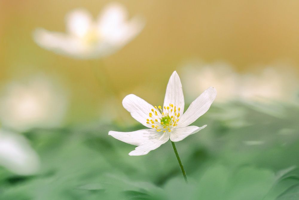 Farbenprächtige Pracht, grün und gelb, bei den Waldanemonen. Diese Blumen können einen ganzen Wald bedecken. Beeilen Sie sich, denn sie werden bald weg sein!