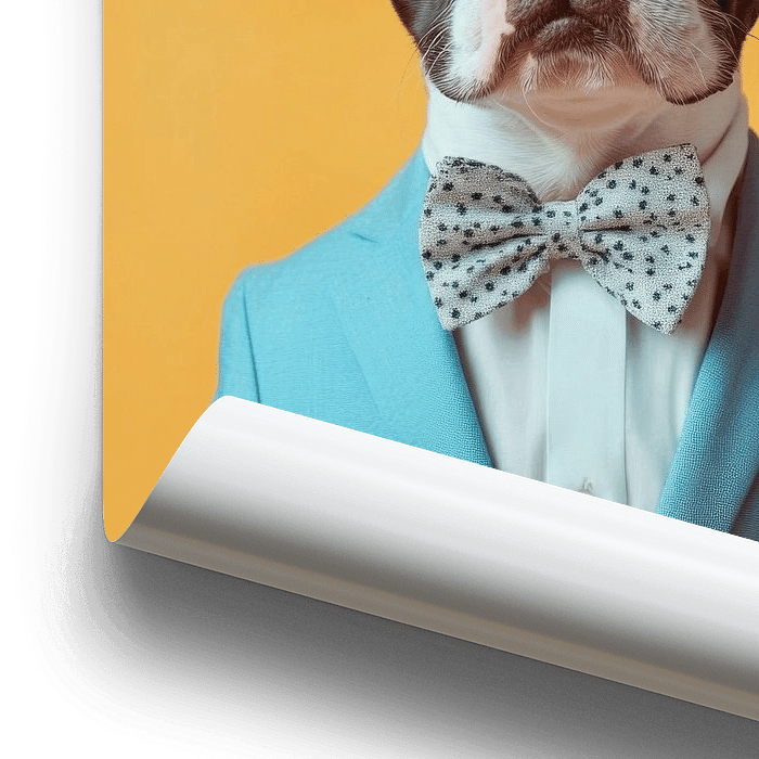 In einem eleganten blauen Anzug und mit einer charmanten Fliege präsentiert sich dieser Boston Terrier als echter Dandy. Seine großen, ausdrucksvollen Ohren und das freundliche Gesicht strahlen eine Mischung aus Humor und Stil aus. Auf dem leuchtend gelben Hintergrund wirkt er zugleich schick und verspielt, bereit für jedes Abenteuer…