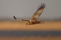 Ein Braunweihe (Männchen) auf der Jagd über den Schilffeldern am Zwarte Meer. Es ist immer wieder ein wunderschöner Anblick, wenn man sie auf der Suche nach Beute so tief über dem Schilf schweben sieht.