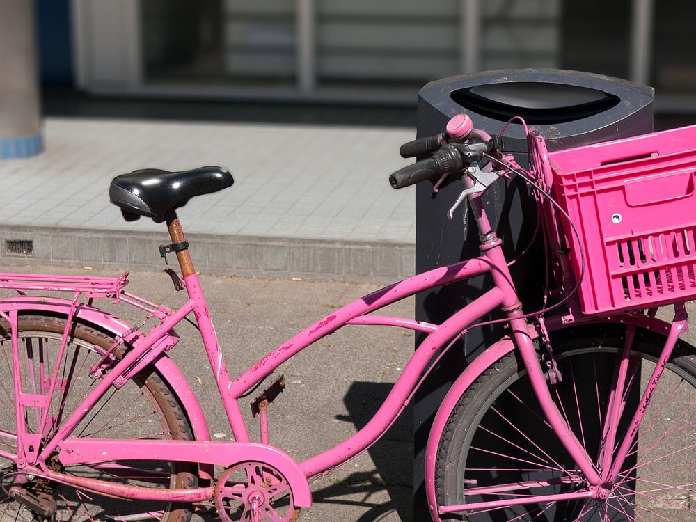 Bright Rose Fahrrad mit rosa Box vor dem Bahnhof in der Sonne