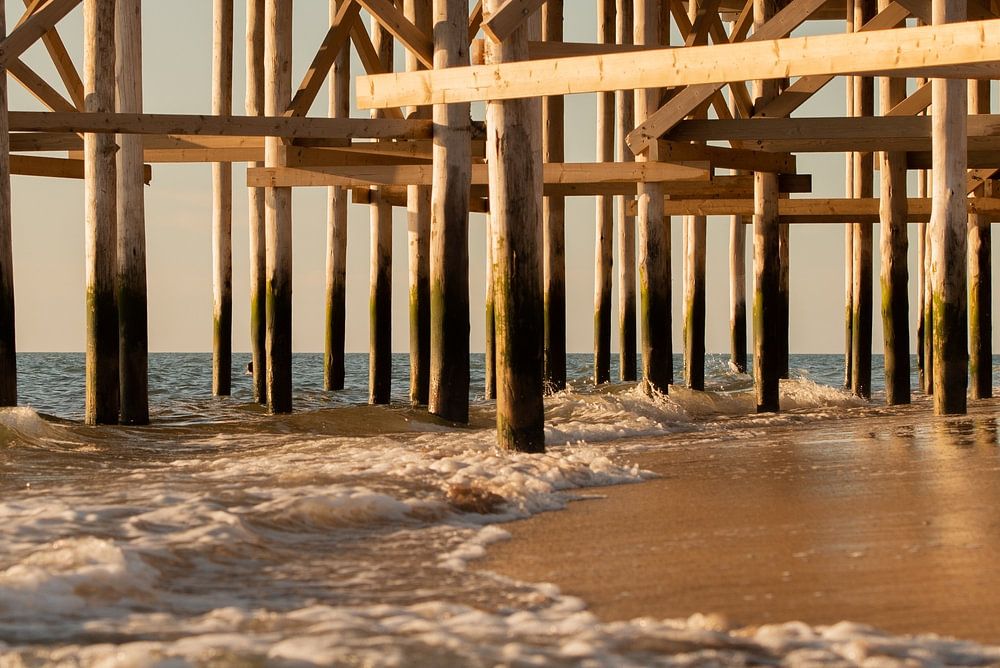 Dieses Gerüst wurde inzwischen durch Stahl ersetzt, was verständlich ist, aber das Holz hatte am Meer mehr Charme. Bei Ebbe konnte man zwischen ihnen hindurchgehen, bei Flut nicht.