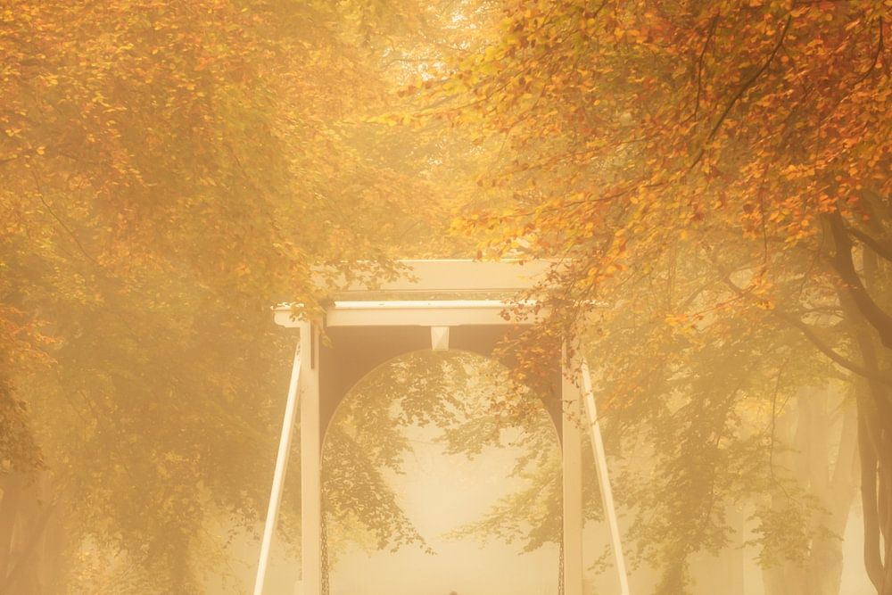 Elemente: Kleine Brücke, Spaziergänger, Nebel, Herbstfarben, Waldlandschaft