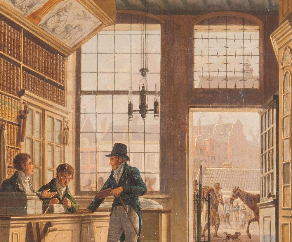 Das Geschäft des Buchhändlers Pieter Meijer Warnars am Vijgendam in Amsterdam, Johannes Jelgerhuis Diese Buch- und Druckerei war der Treffpunkt der kulturellen Elite Amsterdams. Warnars, der Eigentümer, war gleichzeitig Buchhändler, Verleger und Drucker. Die vollen Bücherregale, das hängende Banner, die unbenutzten Papierstapel und die Druckmaschine auf dem Boden zeugen davon. Der Schöpfer dieses Gemäldes, Johannes Jelgerhuis, war nicht nur ein Maler, sondern auch ein bekannter Bühnenschauspieler. Der starke perspektivische Effekt lässt das Innere des Ladens wie ein Bühnenbild aussehen, mit einer Stadtlandschaft auf der Rückseite der Leinwand.