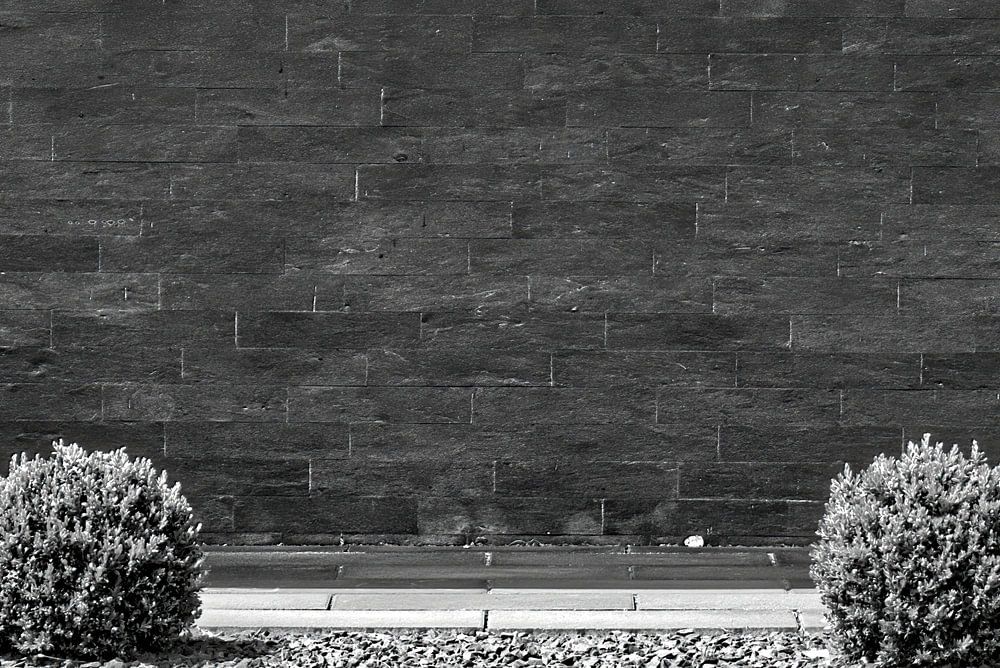 Kleine grüne Sträucher in einem toten Kiesbett in einem grauen Pflaster vor einer schwarzen Steinmauer, minimalistische depressive abstrakte Konzept