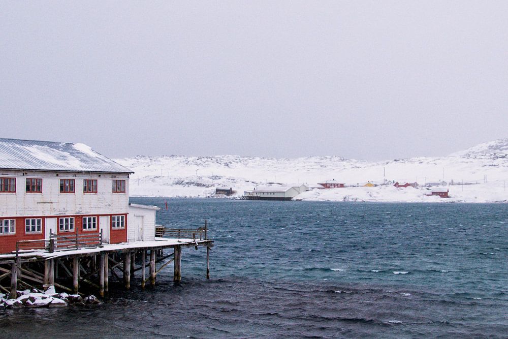 Ein windiger Tag in Bugøynes, Norwegen. Eine dicke Schneeschicht um das Wasser und eine kleine Kabine über dem Wasser.