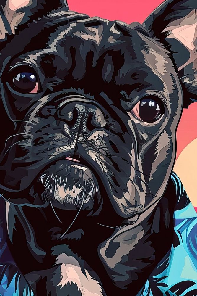 Bulldogge | Französische Bulldogge Kunst - Dieses lebhafte Porträt einer Französischen Bulldogge in einem himmelblauen Hawaiihemd vor einem feurigen Sonnenuntergang ist eine verspielte Mischung aus Pop-Art und modernem Grafikdesign. Der energiegeladene rosafarbene Hintergrund in Kombination mit der Silhouette von Palmen lässt sofort Urlaubsstimmung aufkommen. Die Verwendung scharfer Linien und kontrastreicher Farben in dem Kunstwerk zieht die Blicke auf sich und macht es zu einem mutigen Statement in jeder modernen Einrichtung.