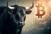 Ein majestätischer Stier mit kräftigen Hörnern symbolisiert Stärke und Wachstum, während das strahlende Bitcoin-Symbol im Hintergrund die Dynamik der digitalen Währung einfängt. Diese kraftvolle Darstellung eignet sich perfekt für ein Büro oder einen kreativen Arbeitsraum, um Motivation und den Geist unternehmerischen Denkens zu fördern.