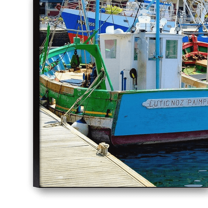 Bunte Fischerboote im Hafen von Paimpol in der Bretagne, Frankreich, im Sommer mit farbigen Gebäuden im Hafen im Hintergrund.