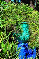 Ein schöner türkisfarbener Blumentopf steht auf einem dunkelblauen Gefäß. Kaskadenförmige und exotische Pflanzen vervollständigen dieses Bild der farbenfrohen Pflanzgefäße im Jardin Majorelle in Marrakesch, Marokko.