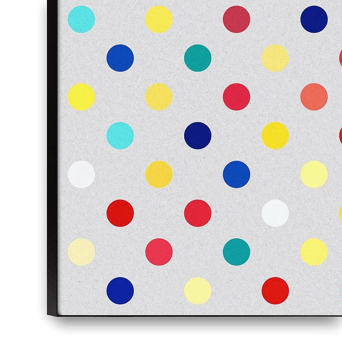In diesem bunten Polka-Dot-Muster sind zufällige Farbpunkte in einem versetzten, regelmäßigen Raster auf einer hellgrauen Papierstruktur angeordnet - ein Spiel mit Farbe und Randomisierung.
