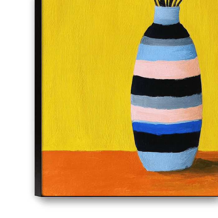 Dieses farbenfrohe Gemälde zeigt eine blau-orange-schwarz gestreifte Vase mit Blumen vor einem leuchtend gelben Hintergrund. Kleine Pinselstriche und einfache Formen schaffen einen charmanten, reduzierten Stil. Die Komposition erinnert an Blockdrucke und spielt mit kräftigen Farben, inspiriert von Möbius-Designs. Das Werk strahlt Verspieltheit und Modernität aus und eignet sich ideal als dekoratives Wandbild, das jedem Raum Frische und Kreativität verleiht. Perfekt für Liebhaber von schlichter, farbintensiver Kunst.