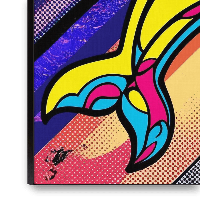 Dieses lebendige und verspielte Design erweckt einen farbenfrohen Delphin im Stil der Pop-Art zum Leben. Das Kunstwerk ist eine wahre Explosion von leuchtenden Farben wie Gelb, Blau, Rosa und Lila, kombiniert mit dynamischen Linien und abstrakten Mustern. Der Delphin scheint fast aus dem Rahmen zu springen und verleiht dem Werk einen…