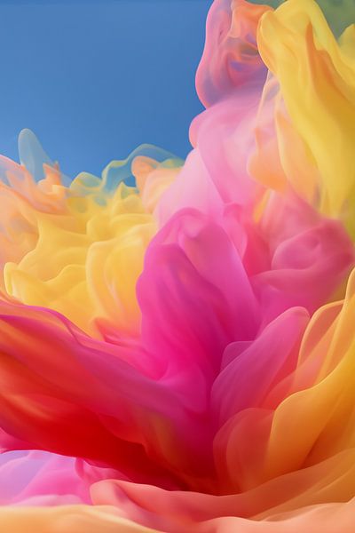 Vor einem himmelblauen Hintergrund schweben bunte Wolken, die an sanften Rauch erinnern. Die Farben Gelb, Orange, Rosa, Lachs, Pink und Rot verschmelzen miteinander und erzeugen ein lebendiges, zugleich zartes Farbspiel, das leicht und poetisch wirkt. Durch die weichen Übergänge zwischen den Farbtönen entsteht der Eindruck von Bewegung…