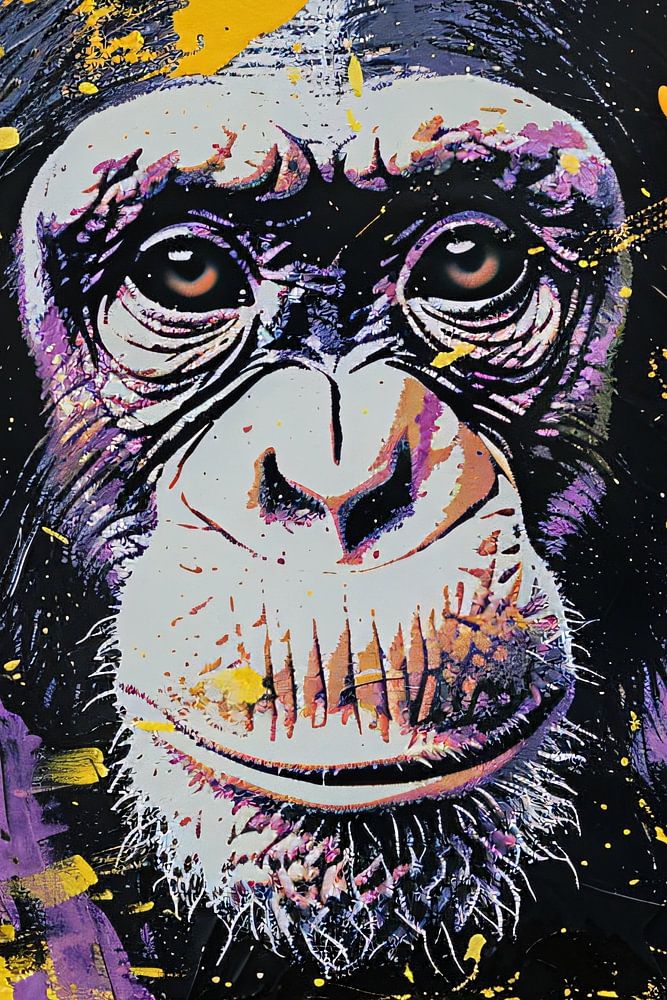 Dieses wunderschöne Pop-Art-Gemälde eines Affen zieht in jedem Raum die Aufmerksamkeit auf sich. Mit seinen leuchtenden Farben und seinem dynamischen Design bringt es ein verspieltes und modernes Gefühl in Ihr Interieur. Die Mischung aus gelben, schwarzen, weißen und violetten Tönen verleiht dem Bild einen einzigartigen Look, der sowohl kraftvoll als auch stilvoll ist. Ideal für das Wohnzimmer, das Büro oder auch ein trendiges Esszimmer. Das detaillierte Gesicht des Affen in Kombination mit abstrakten Farbspritzern erzeugt einen fesselnden visuellen Effekt, der Kunstliebhaber und Gelegenheitsbetrachter gleichermaßen anspricht. Verleihen Sie Ihrem Raum mit diesem auffälligen Kunstwerk einen Hauch von moderner Kunst.
