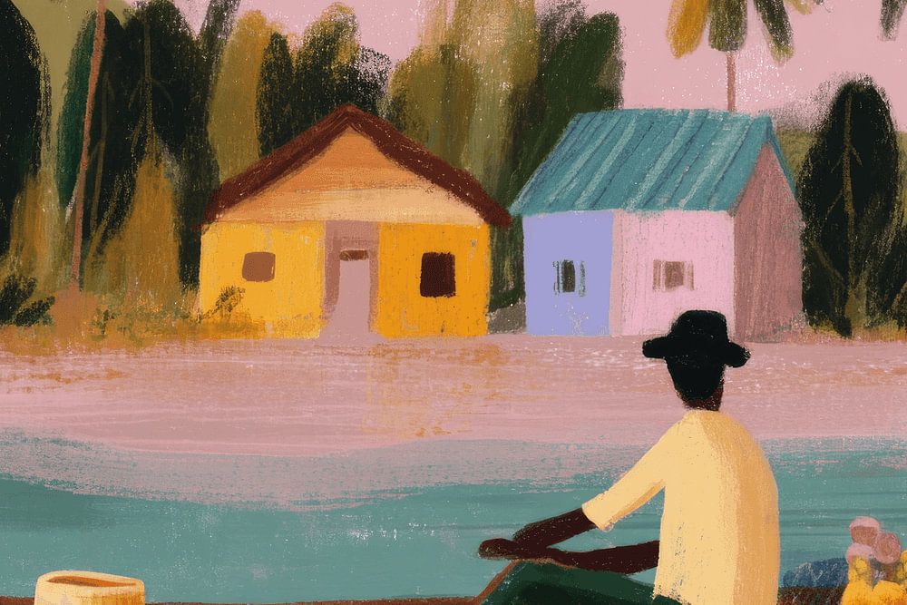 Im Hintergrund zeichnen pastellfarbene Häuser und sich wiegende Palmen eine tropische Kulisse unter einem zartrosa Himmel. Dieses Werk fängt den warmen, zeitlosen Rhythmus des surinamischen Interieurs ein und bringt dieses Gefühl von Einfachheit, Natur und Entschleunigung mühelos an Ihre Wand. Eine Ode an das alltägliche Leben am Fluss, voller Farbe und Charakter. 🌴🛶🍍