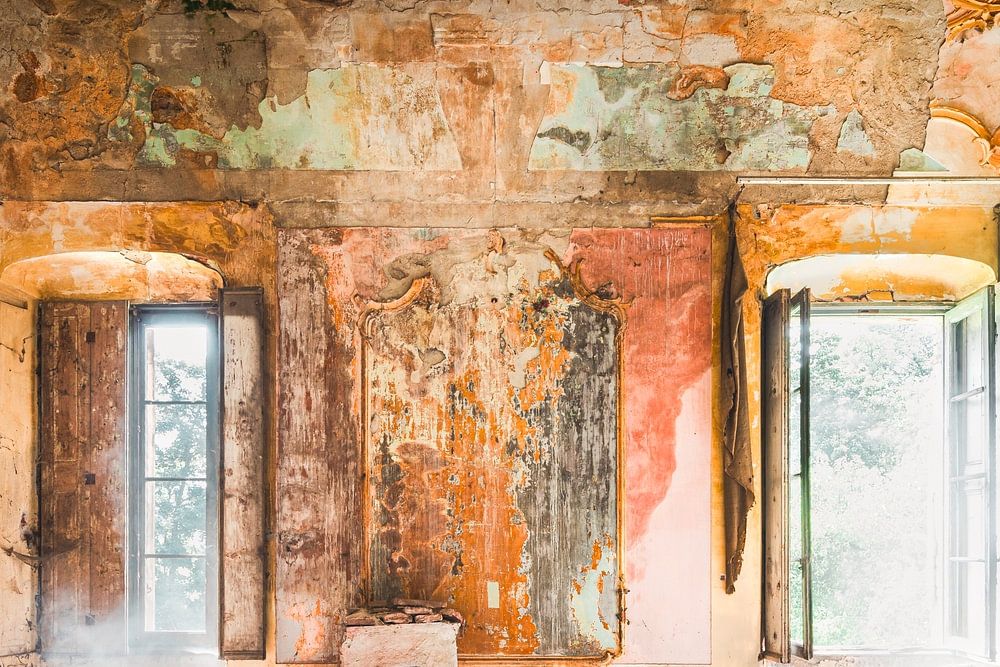 Dies ist eine verlassene Schule in einem abgelegenen italienischen Dorf. Die Schule war groß und hatte mehrere Stockwerke und Eingänge. Sie war auf einem Platz mit einer offenen Mitte gebaut, die jetzt mit Gras und verlassenen landwirtschaftlichen Geräten bedeckt ist.