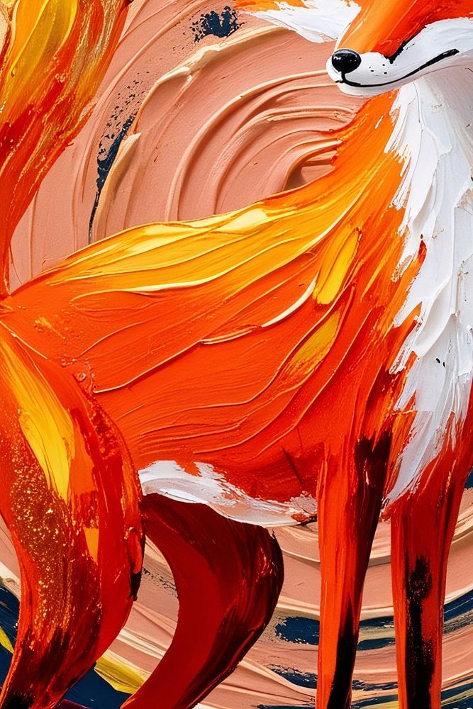 Dieses einzigartige Design zeigt eine ausdrucksstarke Darstellung eines Fuchses in leuchtenden Farben und dynamischen Pinselstrichen. Die feurigen Farben Orange, Rot und Gelb bilden einen auffälligen Kontrast zum dunklen Hintergrund und vermitteln ein Gefühl von Bewegung und Energie. Dieses abstrakte Gemälde fängt die Anmut und Eleganz des Fuchses auf fantasievolle Weise ein, wobei die Pinselstriche durch ihre Textur und Schichtung fast dreidimensional wirken. Es ist ein perfekter Blickfang für moderne Innenräume, insbesondere für kreative Arbeitsbereiche oder Schlafzimmer, in denen ein Hauch von Farbe und Originalität gewünscht wird. Dieses Design vermittelt ein Gefühl von Verspieltheit und künstlerischem Flair und ist eine perfekte Ergänzung für Liebhaber ausdrucksstarker Kunst.