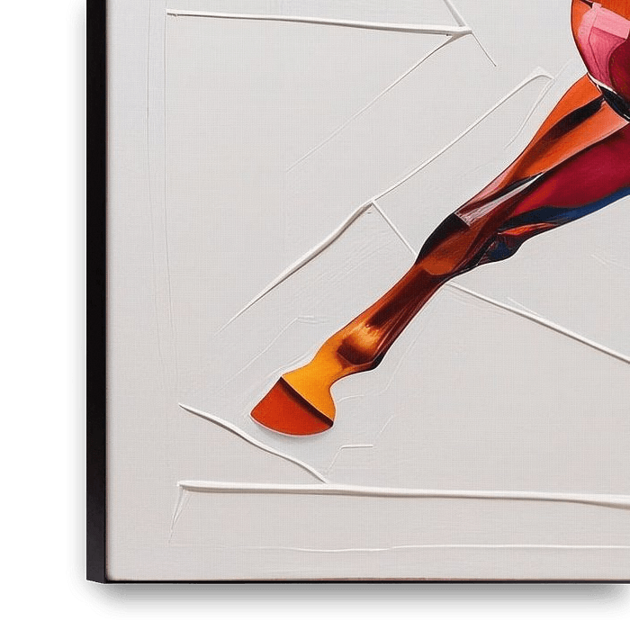 Dieses auffällige und farbenfrohe Kunstwerk zeigt eine abstrakte Darstellung eines Pferdes, die in einer lebhaften Kombination von Farben wie Blau, Rot und Orange ausgeführt ist. Das Pferd ist in einem kubistischen Stil dargestellt, wobei verschiedene geometrische Formen ein dynamisches Ganzes bilden. Dieses einzigartige Design passt…