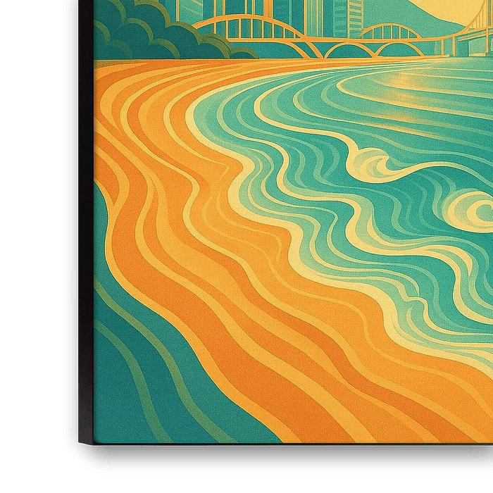 Dieses Kunstwerk fängt den aufmunternden und energiegeladenen Geist von Busan ein, Südkoreas legendärer Küstenmetropole. Bekannt für seine Strände, Wolkenkratzer und die pulsierende Kultur am Wasser, wird Busan durch eine warme Sonnenaufgangspalette aus goldenen Gelbtönen, sanften Orangetönen und tiefen Aquamarintönen wunderschön dargestellt. Die Illustration zeigt die Stadt, die mit dem ersten Licht des Tages erwacht - ein Moment, in dem das Meer sanft auf die Küstenlinie trifft und die Sonne hinter der modernen Skyline aufgeht.