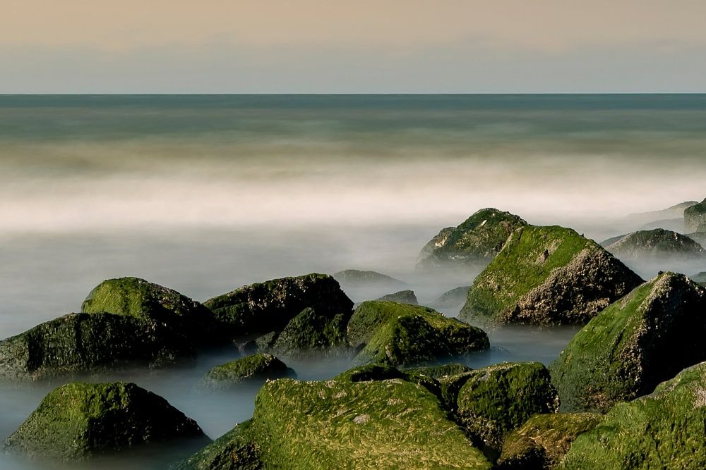 Felsensteine am Strand von Cadzand-Bad an der Westerschelde mit Blick auf die Nordsee. Aufnahme mit langer Verschlusszeit bei stürmischem Wetter und Springflut.