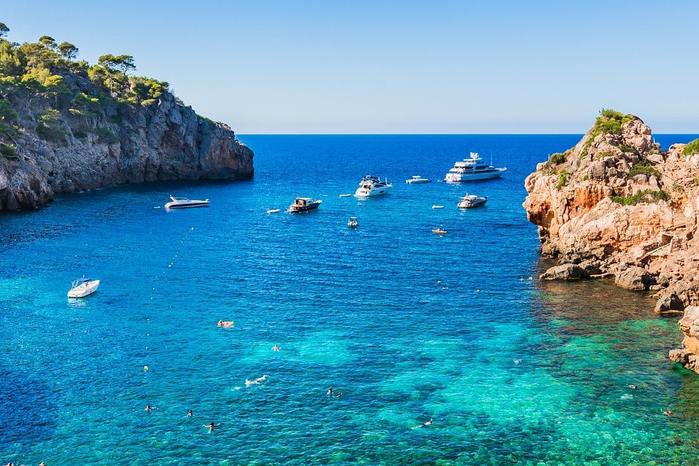 Schöne Strandbucht mit ankernden Booten in Cala Deia, Insel Mallorca, Spanien Mittelmeer