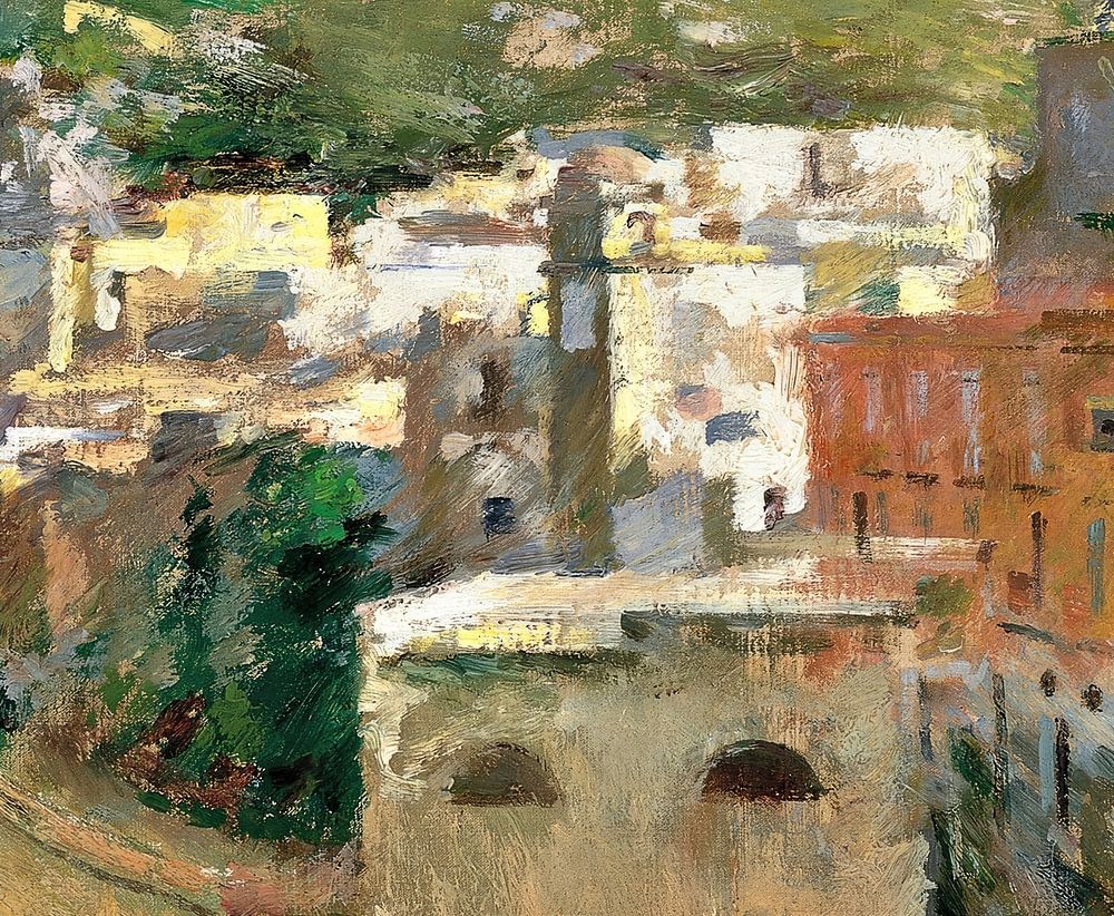 Capri von Theodore Robinson ist ein heiteres und bezauberndes Gemälde, das die Schönheit der italienischen Insel Capri einfängt. Das Kunstwerk zeigt eine Küstenszene mit kristallklarem, türkisfarbenem Wasser, felsigen Klippen und leuchtend grüner Vegetation.