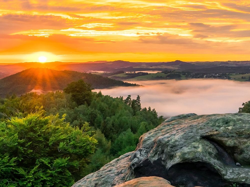 Meine Tour entlang des Reitsteigs im Elbsandsteingebirge nahm an diesem Wandertag ihren krönenden Abschluss am Carolafelsen. Das ist keineswegs übertrieben, denn der mich erwartende Sonnenuntergang – nach einem Nachmittag voll Wolken und Regen – war ein wunderschönes Erlebnis und hüllte die Landschaft in majestätisches Licht. Sonnenstrahlen durchdrangen die am Himmel schwebenden Wolken, durchdrangen auch die im Tal ruhenden Wolken, alles leuchtete. Unvergesslich.