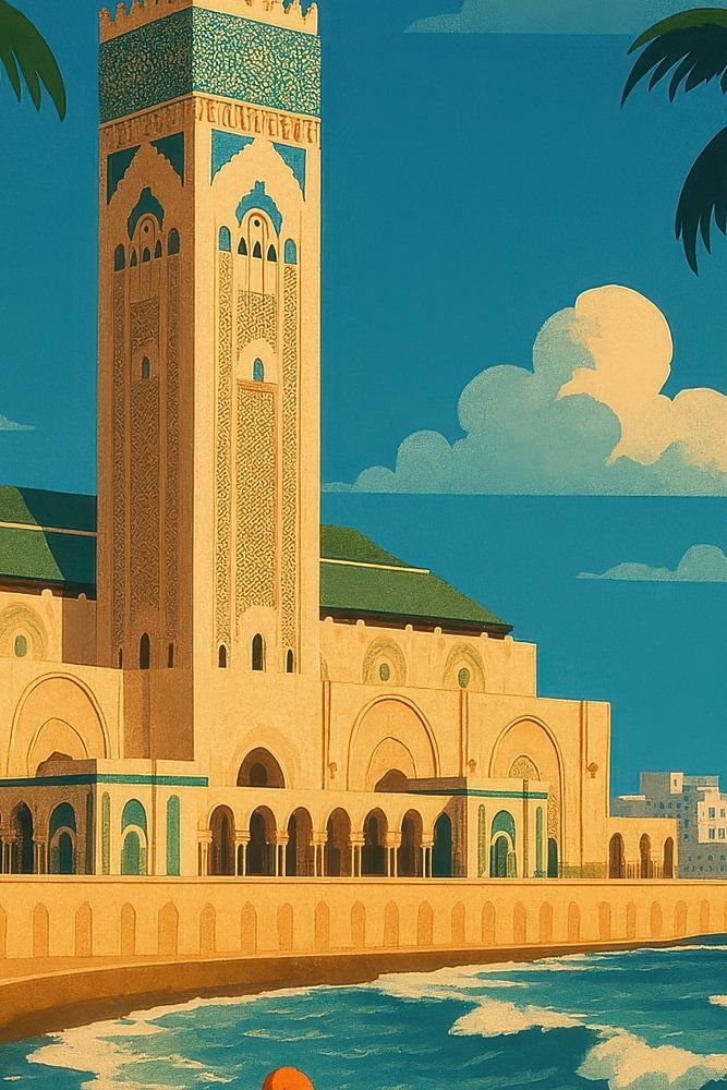 Mit vibrierenden Farben und einem Hauch von Nostalgie entführt diese Illustration in die Strände von Casablanca. Die majestätische Architektur der Moschee, umrahmt von hohen Palmen und dem glitzernden Meer, sorgt für ein mediterranes Flair. Ideal für das Wohnzimmer, haucht es jedem Raum Leben und eine Prise Fernweh ein.