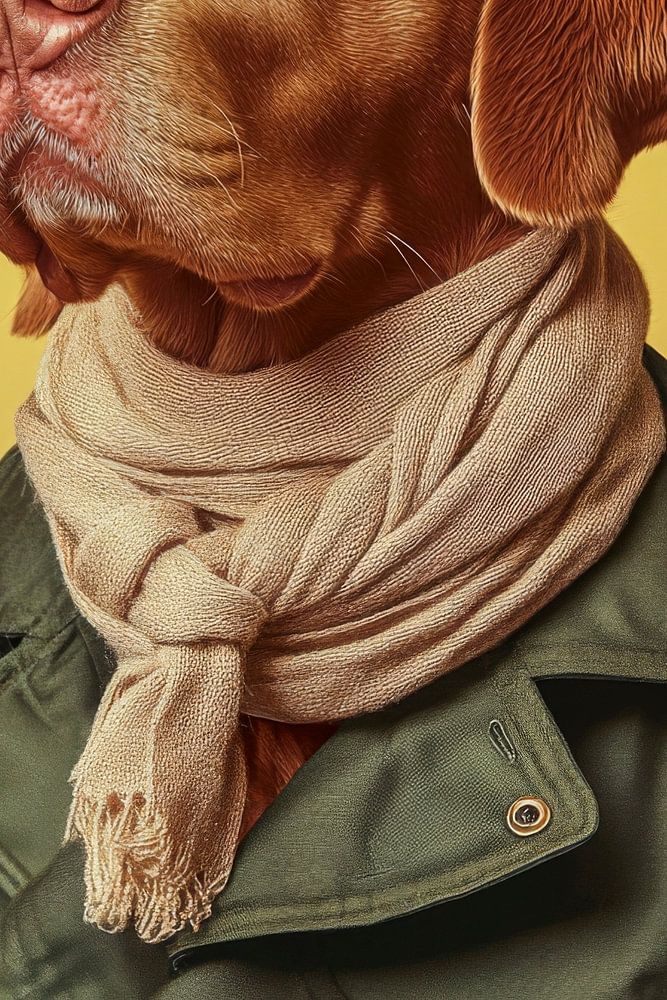 Mit seinem freundlichen, intelligenten Blick und dem glänzenden, ins Goldene gehenden Fell strahlt dieser Chesapeake Bay Retriever Wärme und Charme aus. Die stilvolle Kombination aus Schal und Jacke verleiht ihm einen Hauch von Eleganz, während seine aufrechte Haltung und die kraftvollen Kiefer seine robuste Herkunft als treuer Begleiter und leidenschaftlicher Wassersportler unterstreichen.