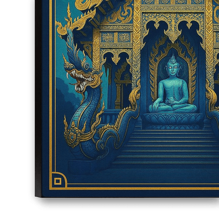 Jede Kurve, jede Schnitzerei und jedes ornamentale Element ist sorgfältig dargestellt und zeigt die kühne Verschmelzung der traditionellen Lanna-Architektur mit der modernen künstlerischen Interpretation des Tempels. Die gewundenen blauen Wächterschlangen, die die Stufen des Tempels flankieren, verleihen diesem ein Element der Macht und des Schutzes und lenken den Blick des Betrachters auf die ruhige Buddhafigur, die am Eingang sitzt. Diese zentrale Figur verankert das Werk und verstärkt das Gefühl von Frieden, spiritueller Klarheit und Ausgeglichenheit.