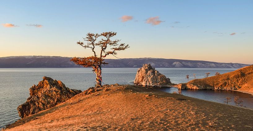 Ein einsamer, mit bunten Bändern geschmückter Baum wacht bei Sonnenuntergang am so genannten Schamanenfelsen über das Ufer der Insel Olchon, die mitten im Baikalsee in Sibirien, Russland, liegt.