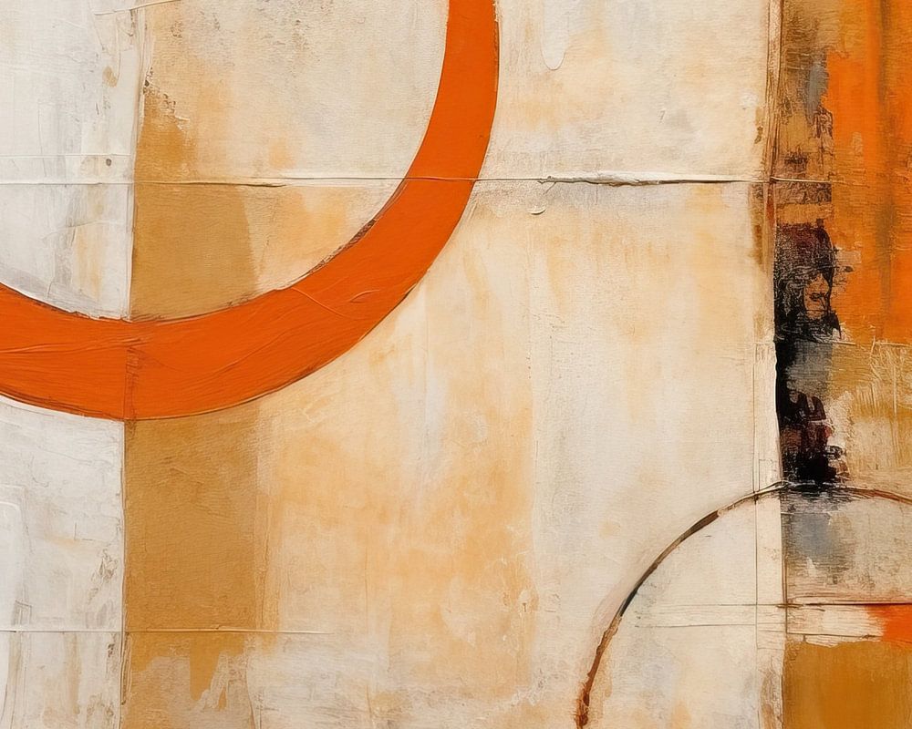 Circle Orange | Shades of Sunset Dreams - Dieses abstrakte Gemälde zeigt eine dominante orange Farbe, die große geometrische Formen von Kreisen und Rechtecken vor einem Hintergrund aus Beige- und Weißtönen darstellt, wobei Texturen und Kratzer sichtbar zu einem Gefühl von Tiefe und Geschichte beitragen.
