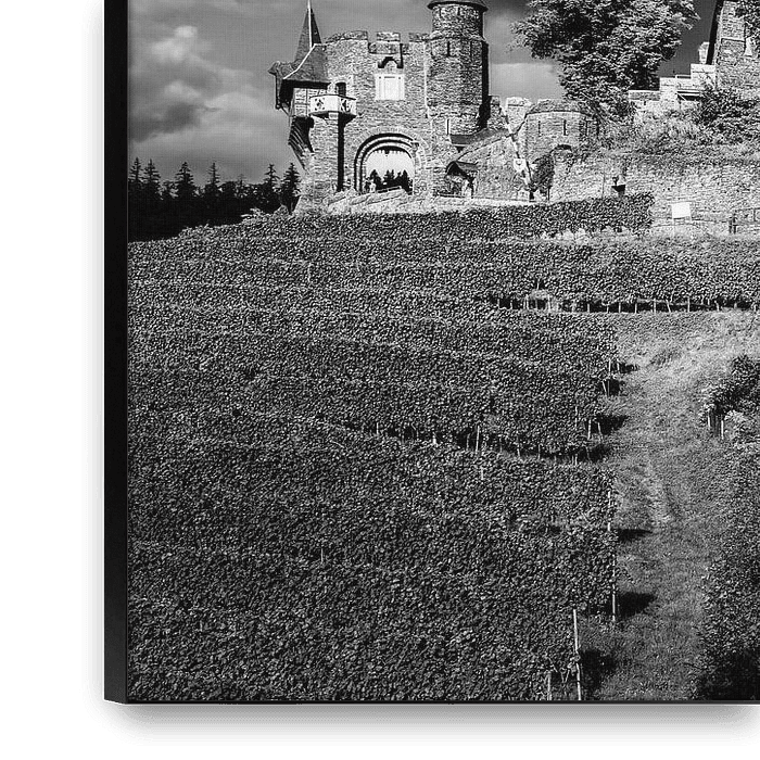 Die Burg Cochem an der Mosel mit dramatischem Wolkenhimmel in schwarzweiß.